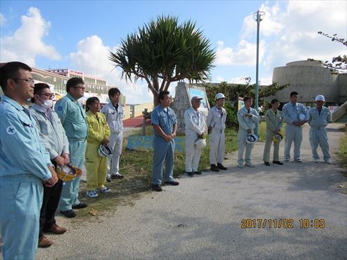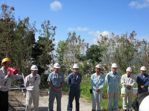 ⑧AM10:45うるま市平安座消防出張所職員、うるま市電業会と写真撮影し「地震・津波避難訓練」終了。
